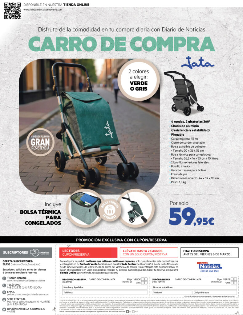 También puedes solicitarlo en nuestra sede central en Huarte (Polígono Areta, C/ Altzutzate, Nº10) de lunes a viernes de 09.00 a 15.00h, en el teléfono 948 33 25 33 o en el email pedidos.promociones@noticiasdenavarra.com