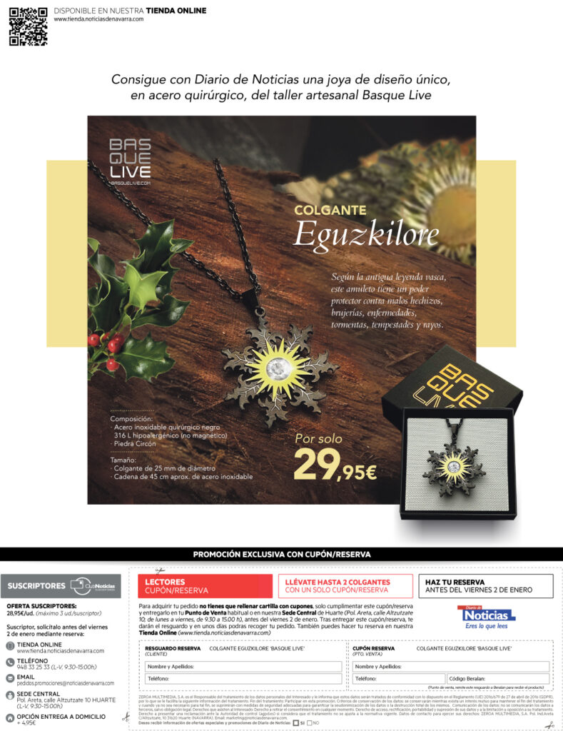 También puedes solicitarlo en nuestra sede central en Huarte (Polígono Areta, C/ Altzutzate, Nº10) de lunes a viernes de 09.00 a 15.00h, en el teléfono 948 33 25 33 o en el email pedidos.promociones@noticiasdenavarra.com