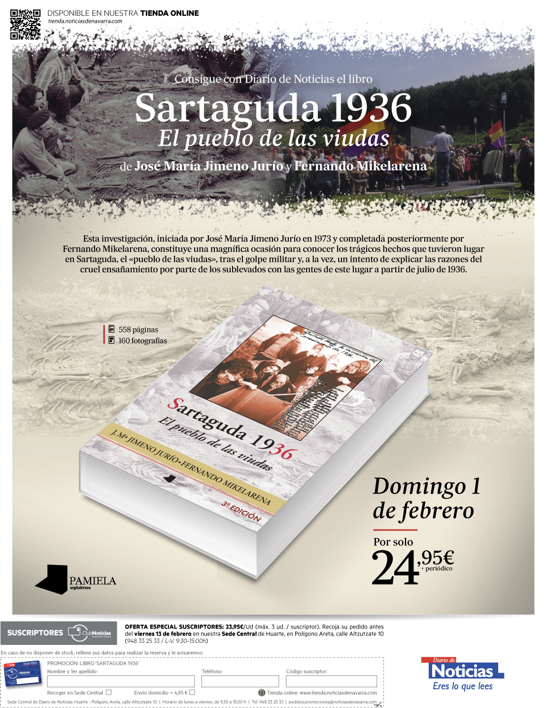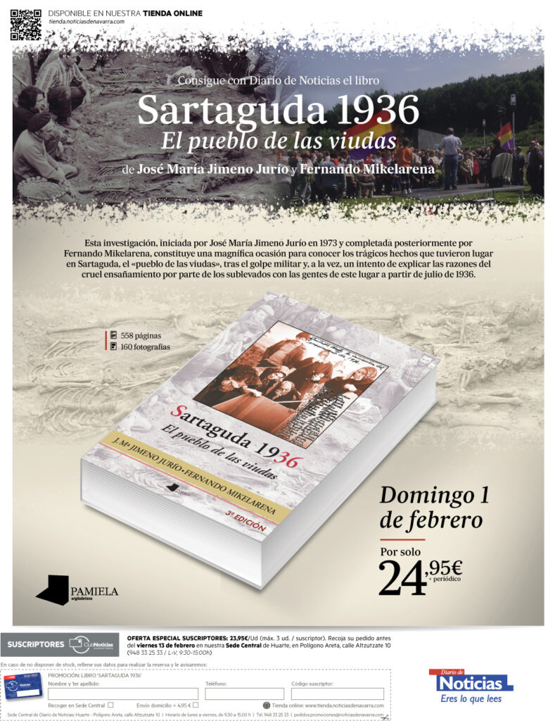 Consigue con Diario de Noticias el libro Sartaguda 1936. El pueblo de las viudas, de José María Jimeno Jurío y Fernando Mikelarena.