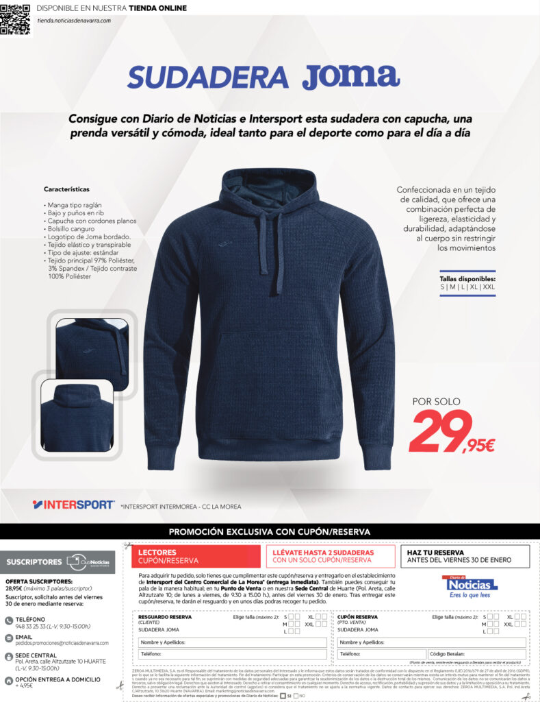 Consigue con Diario de Noticias e Intersport esta sudadera con capucha de la marca Joma, una prenda versátil y cómoda, ideal tanto para el deporte como para el día a día.