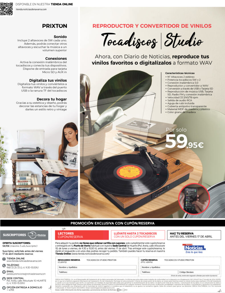 También puedes solicitarlo en nuestra sede central en Huarte (Polígono Areta, C/ Altzutzate, Nº10) de lunes a viernes de 09.00 a 15.00h, en el teléfono 948 33 25 33 o en el email pedidos.promociones@noticiasdenavarra.com
